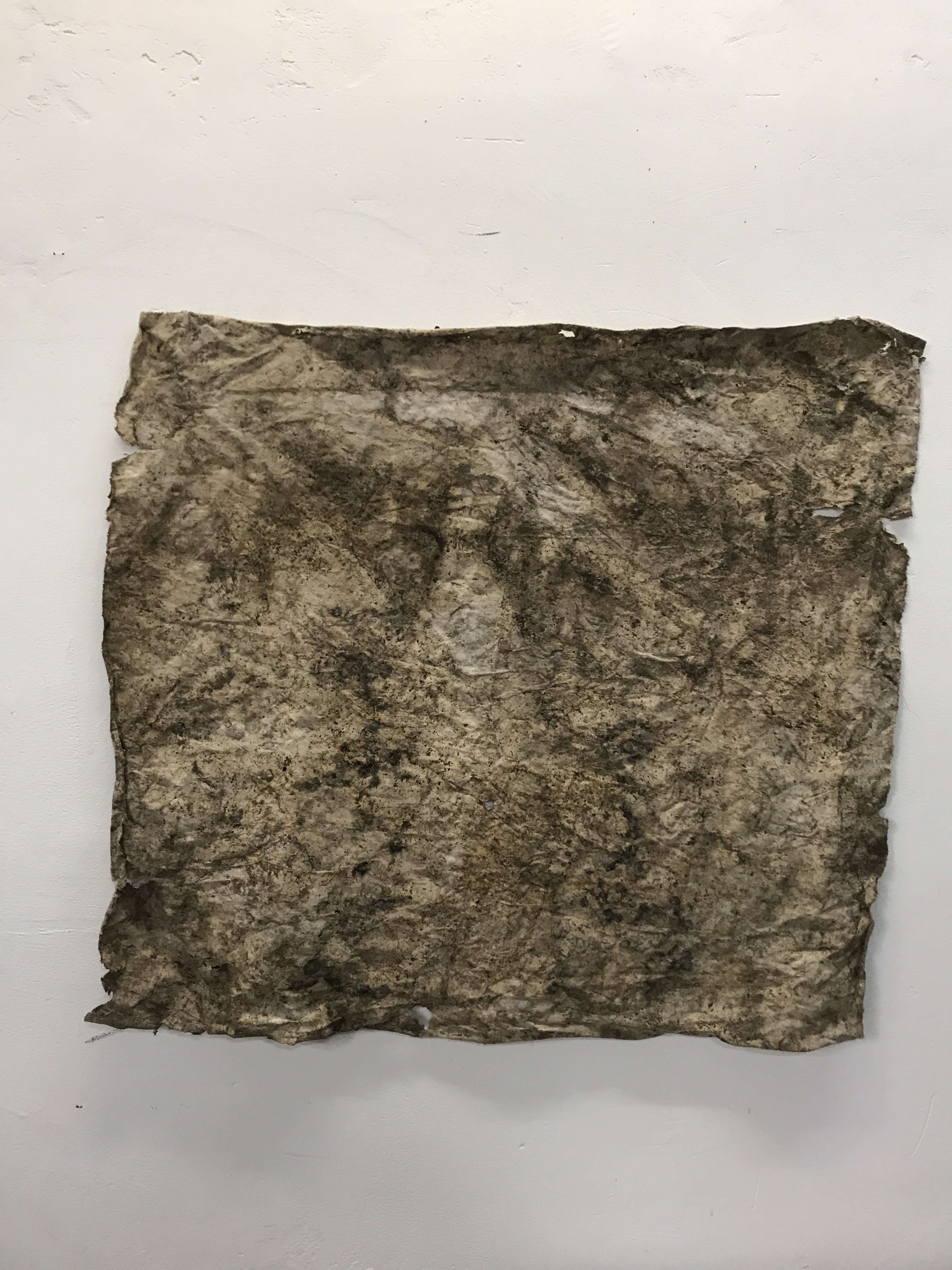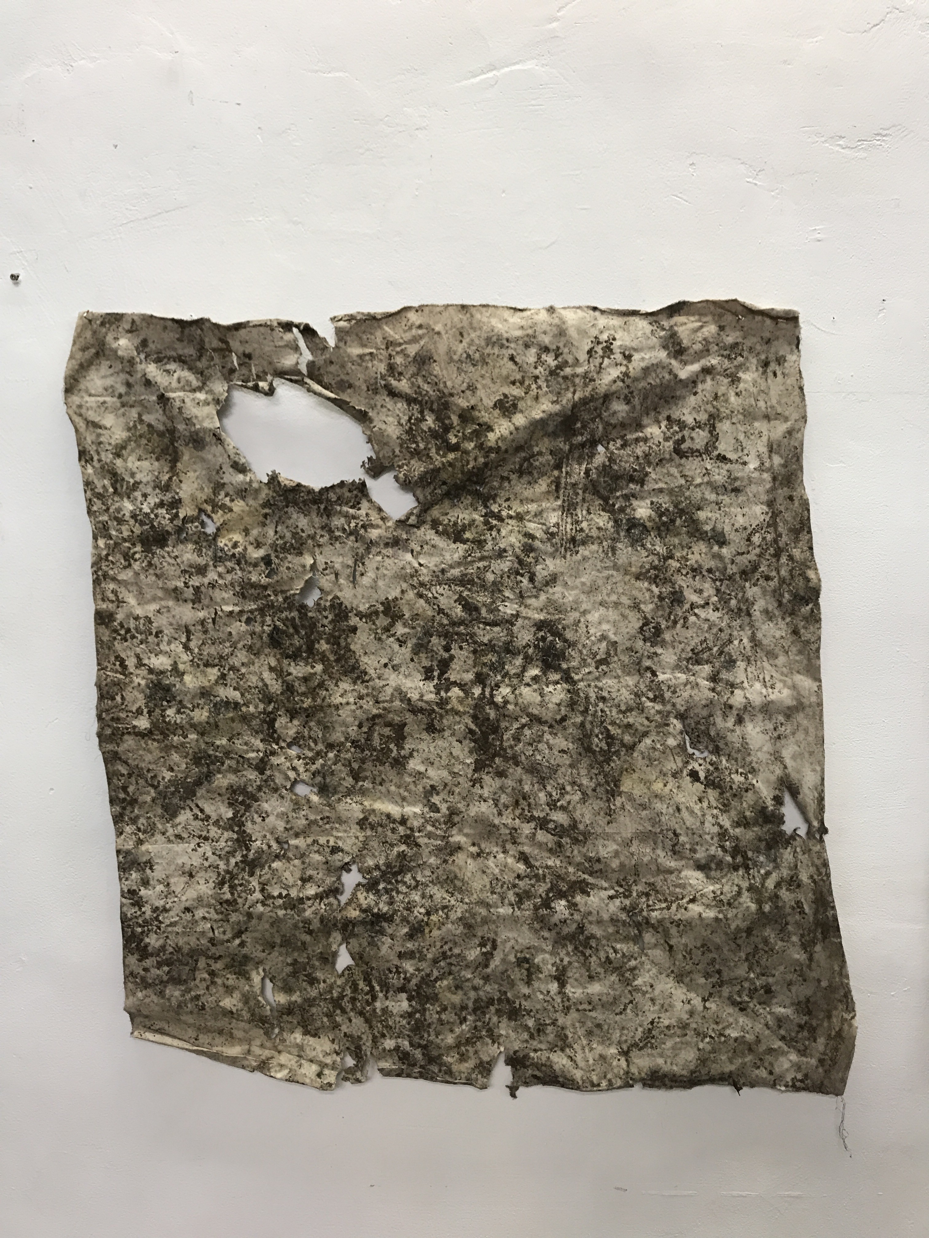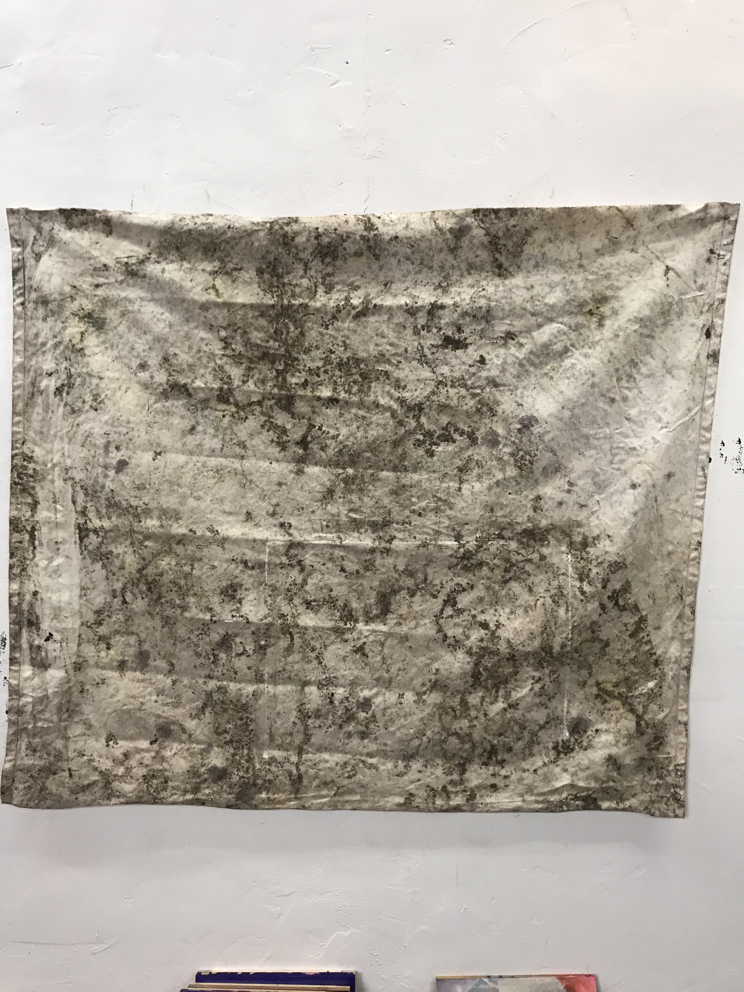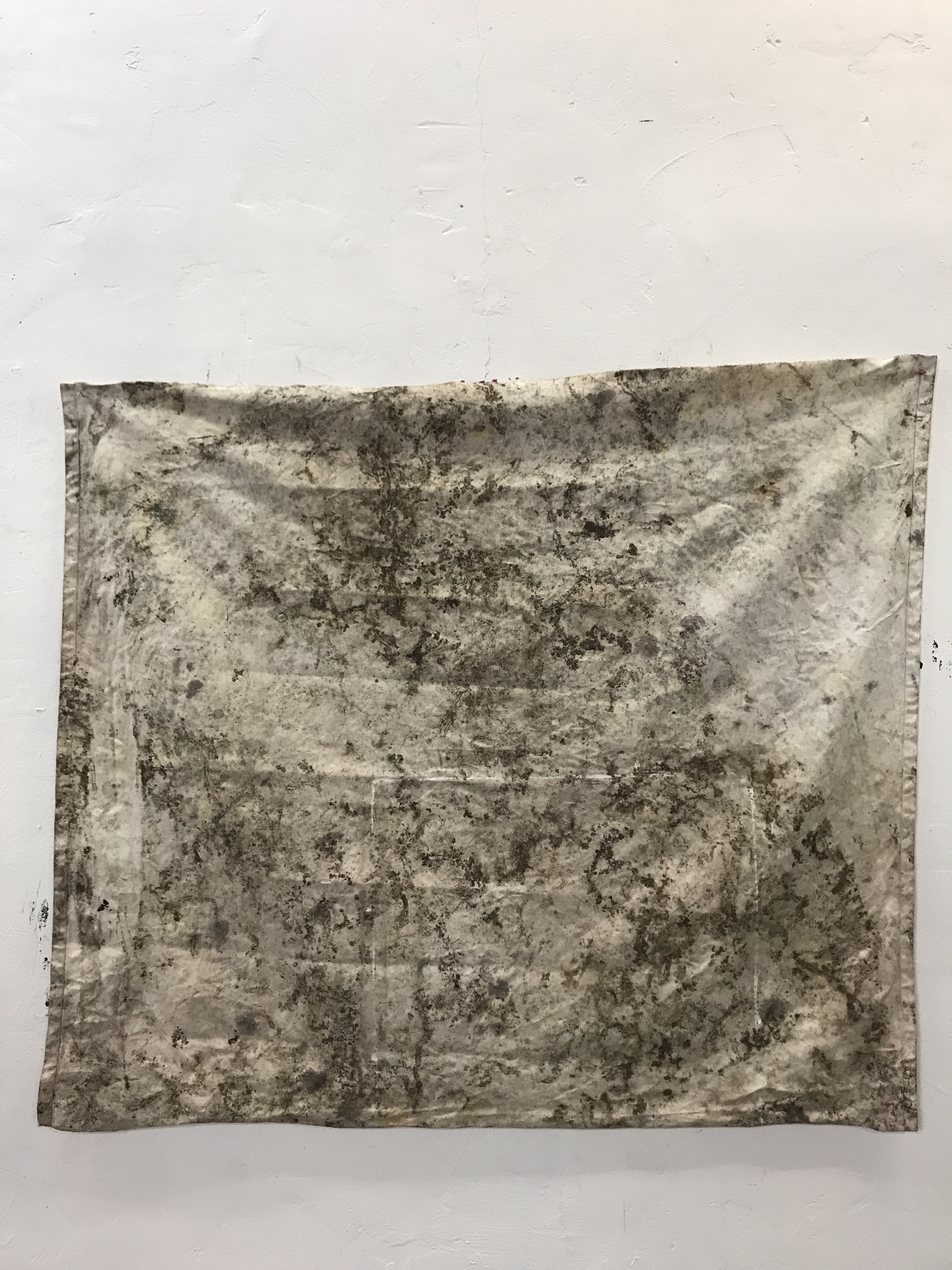 Leinentücher werden von mir eingegraben, ausgegraben und getrocknet. Der Prozess geht über mehrere Wochen und Monate und wird von mir genau schriftlich und bildlich dokumentiert. Zuerst werden unbehandelte weiße, großformatige Leinentücher in der Natur vergraben. Es macht ein großen Unterschied, ob das Leinentuch tief in die Erde eingegraben wird, mit Waldboden bedeckt wird oder im Sumpf oder auf einer Wiese ausgelegt wird. Nach einigen Wochen/Monaten werden die Leinentücher wieder ausgegraben. Sie beinhalten nun Spuren von Erde, Insekten und Pflanzen mit denen sie in Kontakt gekommen sind und nehmen teilweise deren Geruch auf, teilweise zersetzen sie sich an kleineren Stellen – sie sind vom natürlichen Boden „gezeichnet“. Die Leinwände hänge ich direkt im Freien auf. Dort werden sie nochmals den Naturgewalten ausgesetzt. Je nach Witterung (sonnig, heiß, trocken oder kalt, nass, windig) verändert sich die Beschaffenheit der Leinwände (Farbe, Textur) auch hier wieder. Das Besondere an dieser Arbeit ist, dass je nach Ort, Zeitdauer und Wetterverhältnissen sehr verschiedene Ergebnisse entstehen. Die genaue Dokumentation meiner Arbeit ist ein Versuch, meine nähere Umgebung und Umwelt zu kartografieren.