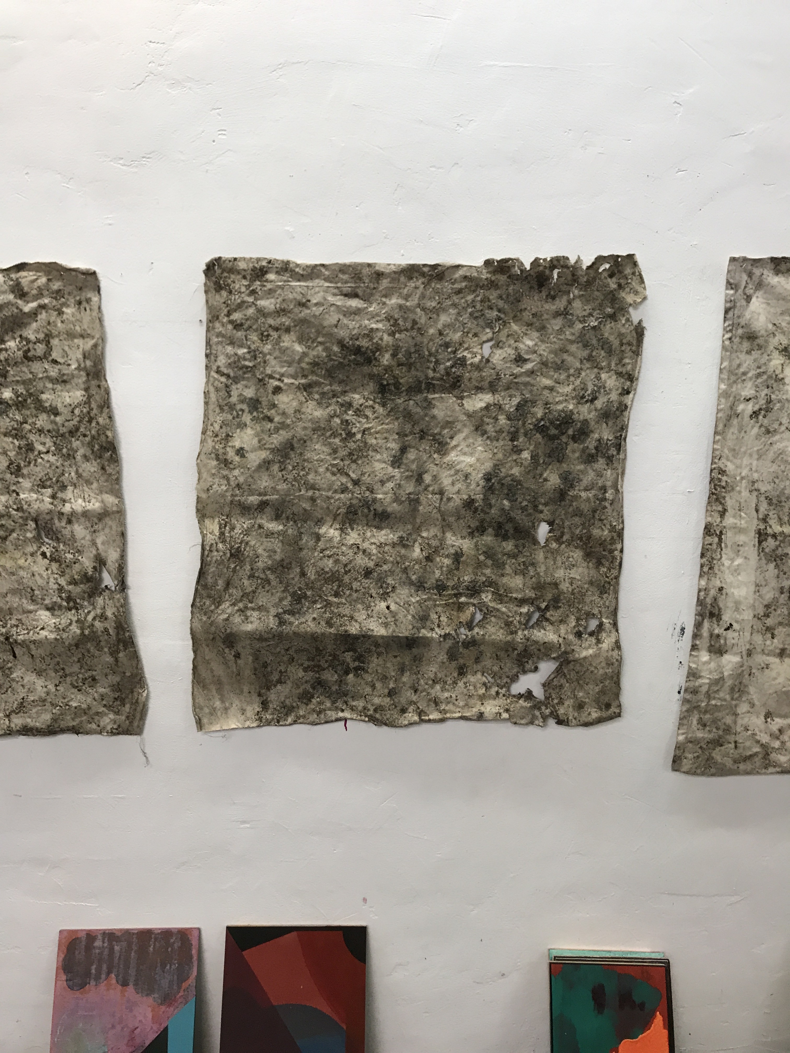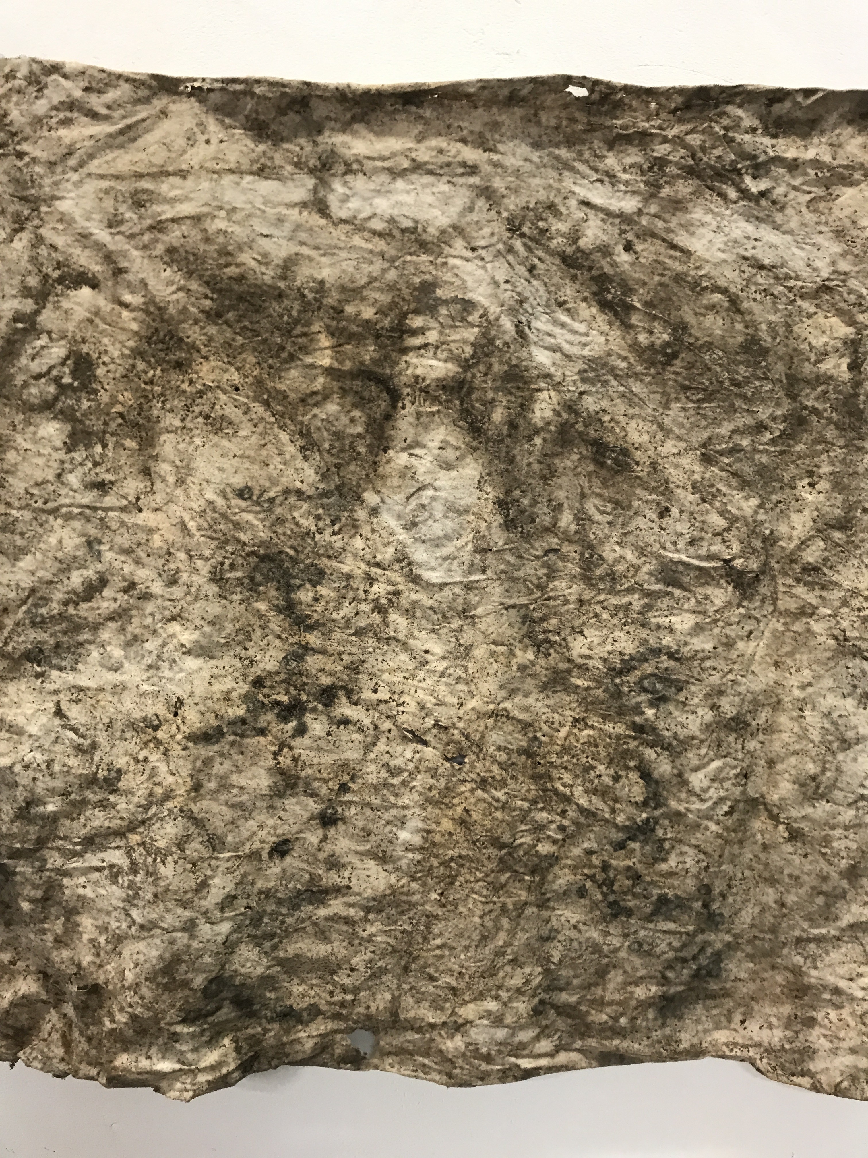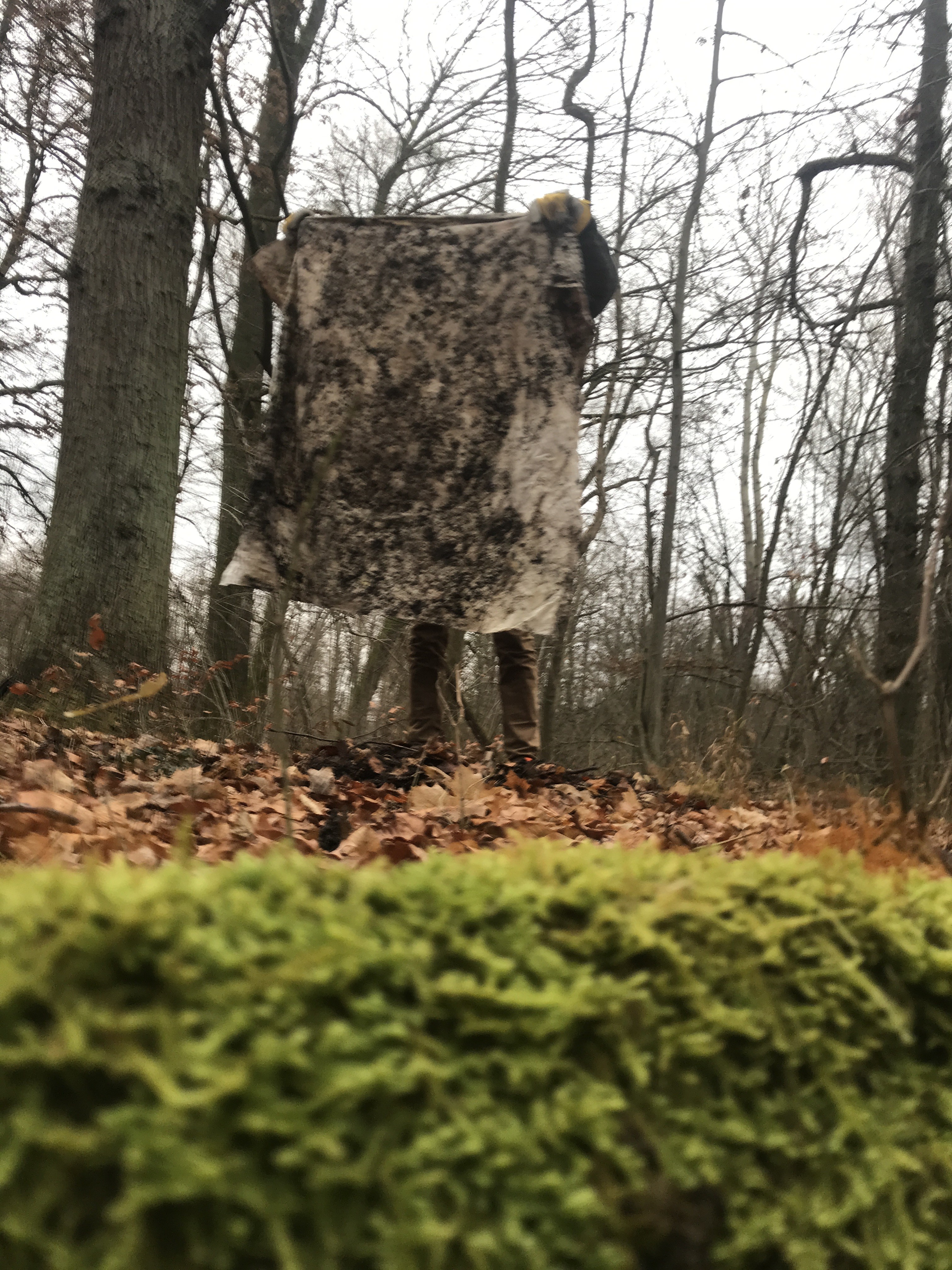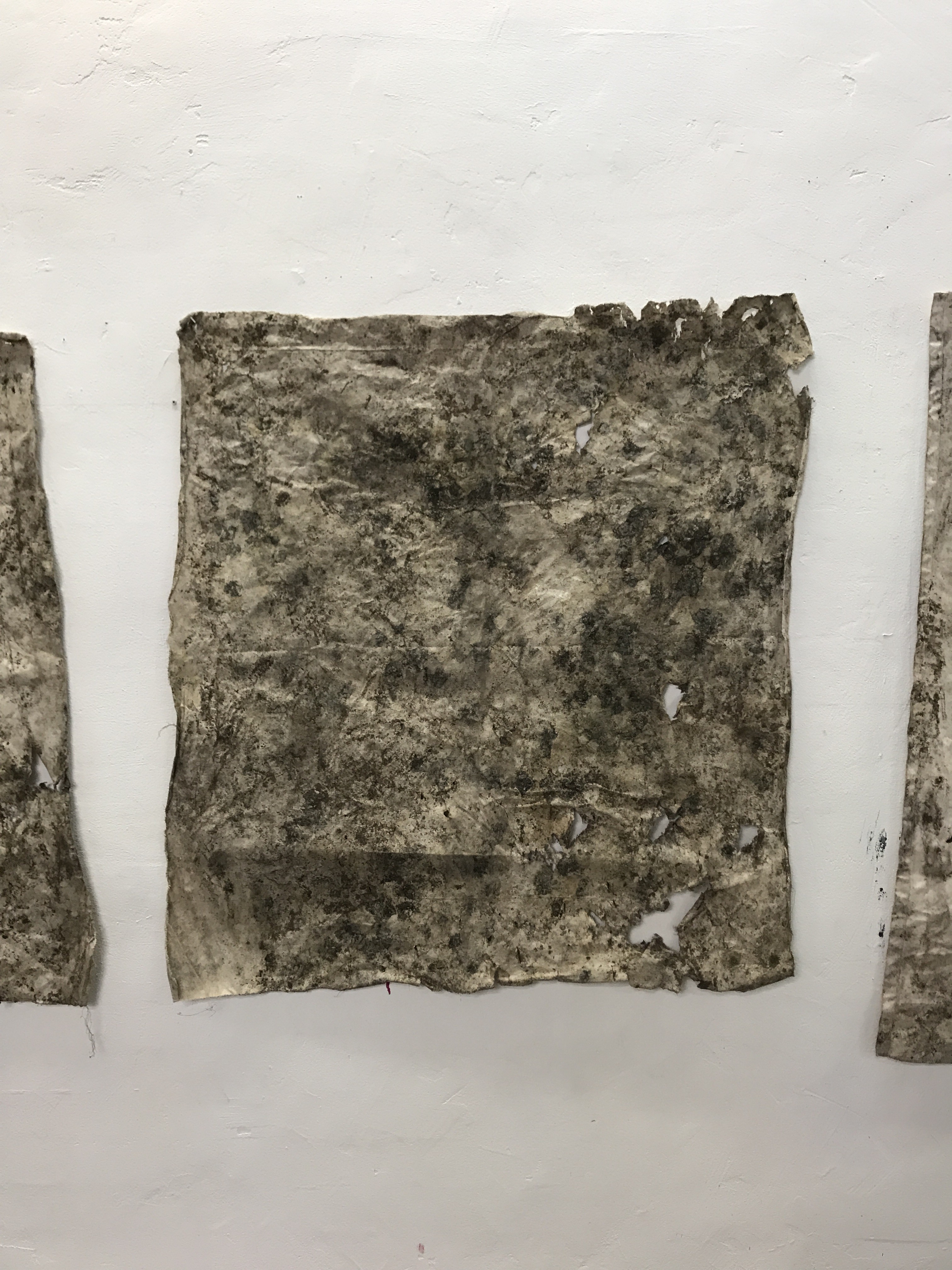 Leinentücher werden von mir eingegraben, ausgegraben und getrocknet. Der Prozess geht über mehrere Wochen und Monate und wird von mir genau schriftlich und bildlich dokumentiert. Zuerst werden unbehandelte weiße, großformatige Leinentücher in der Natur vergraben. Es macht ein großen Unterschied, ob das Leinentuch tief in die Erde eingegraben wird, mit Waldboden bedeckt wird oder im Sumpf oder auf einer Wiese ausgelegt wird. Nach einigen Wochen/Monaten werden die Leinentücher wieder ausgegraben. Sie beinhalten nun Spuren von Erde, Insekten und Pflanzen mit denen sie in Kontakt gekommen sind und nehmen teilweise deren Geruch auf, teilweise zersetzen sie sich an kleineren Stellen – sie sind vom natürlichen Boden „gezeichnet“. Die Leinwände hänge ich direkt im Freien auf. Dort werden sie nochmals den Naturgewalten ausgesetzt. Je nach Witterung (sonnig, heiß, trocken oder kalt, nass, windig) verändert sich die Beschaffenheit der Leinwände (Farbe, Textur) auch hier wieder. Das Besondere an dieser Arbeit ist, dass je nach Ort, Zeitdauer und Wetterverhältnissen sehr verschiedene Ergebnisse entstehen. Die genaue Dokumentation meiner Arbeit ist ein Versuch, meine nähere Umgebung und Umwelt zu kartografieren.
